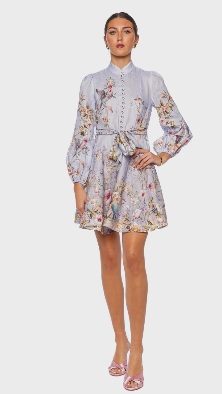 Immerse yourself in the enchanting elegance of the Rebellion Blue Aviary Mini Dress. This exquisite piece features a delicate bird and floral print, capturing a sense of whimsy and sophistication. Crafted from premium fabrics, its long sleeves and flattering silhouette make it ideal for both day and night occasions. Pair it with strappy heels and statement earrings for an effortlessly chic outfit.