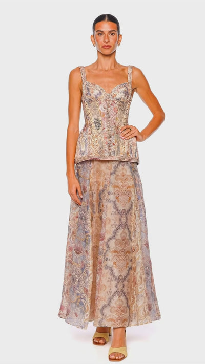This captivating maxi dress beguiles with an intricate spliced floral pattern, exuding an air of timeless romance. The corded detailing enhances its elegant silhouette, offering a luxurious touch to the fitted bodice and flowing skirt. Perfect for an upscale event, this dress embodies sophistication and refined trend-forward aesthetics. Pair it with delicate heels and understated jewelry for a graceful ensemble.
