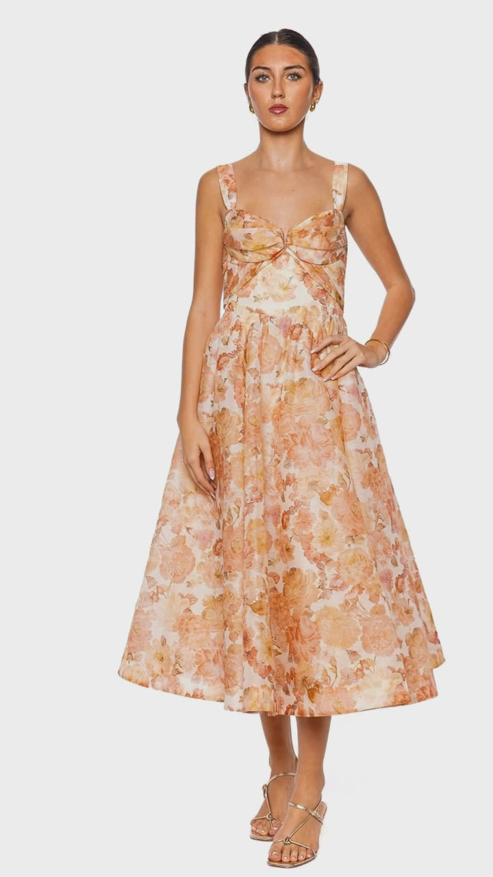 Embrace opulent elegance with this Golden Bloom Drape Midi Dress, showcasing a meticulous floral motif that exudes sophistication. Intricately draped for a graceful silhouette, this piece features a flattering sweetheart neckline complemented by adjustable straps for a personalized fit. Its timeless design is perfect for weddings or any grand occasion, rendering it a truly enchanting ensemble. Style with minimalistic gold jewelry and strappy sandals for an elevated look.