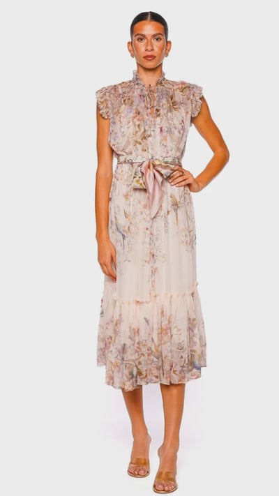 The Rebellion Cream Flutter Sleeve Midi Dress is a testament to exquisite craftsmanship, featuring a delicate floral aviary print on a luxurious fabric. This sophisticated midi-length dress offers an ethereal silhouette with flutter sleeves and a refined bow-tie waist, creating an elegant and timeless look. Perfect for both daytime soirees and evening gatherings, this dress exudes both grace and charm.
