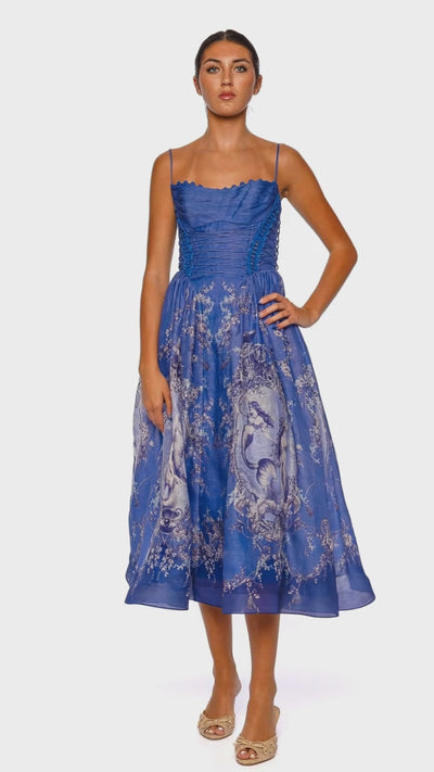 Experience the epitome of luxury and grace with this enchanting midi dress featuring a mesmerizing blue mermaid placement print. The dress is crafted with a sophisticated corset silhouette that accentuates the figure with its subtly flared hem. Pair this masterpiece with elegant heels to intensify its fashion-forward aesthetics.