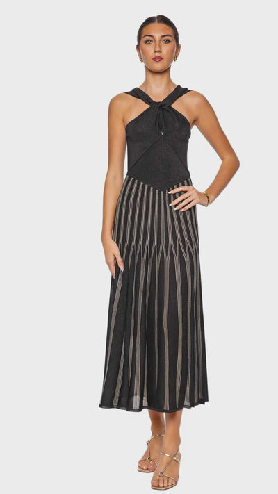 This captivating maxi dress is crafted from a luxurious metallic knit that shimmers elegantly with every movement. Its halter neckline and intricate knot detail at the bust create a striking silhouette, accentuated by the elongating striped design in black and gold. This piece transitions effortlessly from daytime sophistication to evening glamour, ensuring you radiate confidence at any event.