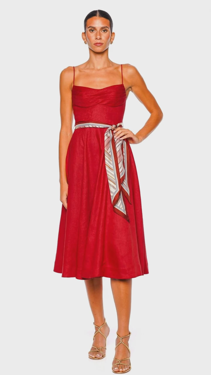 This striking midi dress embodies elegance with its rich red hue and graceful fit-and-flare silhouette. Its spaghetti straps and ruched bodice complement the soft tuck detailing, offering a sophisticated yet youthful allure. The included striped waist tie adds a flair of individuality, perfect for both upscale daytime gatherings and refined evening soirees.