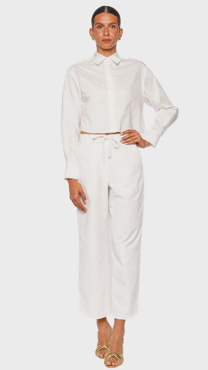 Effortlessly crisp and modern, this cropped white button down shirt is cut from luxurious cotton for a structured yet lightweight feel. The tailored silhouette features a classic collar, concealed placket, and elongated sleeves for a polished finish. Its cropped length adds a contemporary edge, making it a versatile staple for elevated day-to-night looks. Pair with high-waisted trousers and gold heels for a refined, trend-forward ensemble.