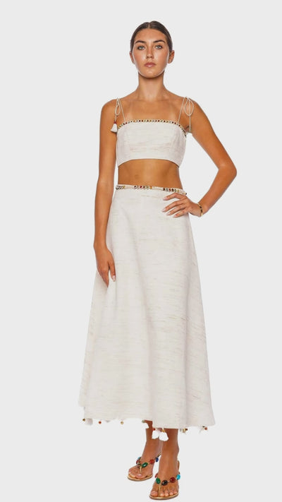 This textured midi skirt features an A-line silhouette and is enhanced with beaded tassel trim details at the hem. Complete with a beaded rope self-tie belt.