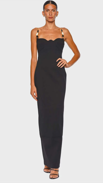 The Riccardo Gown delivers striking evening elegance with a sleek column silhouette and a refined black finish. Designed with a sculpted sweetheart neckline, this floor-length style is elevated by statement embellished straps with gold-tone chain detailing for a distinctly luxurious touch. The tailored fit contours the body beautifully, while the back slit adds graceful movement and modern allure. Style it with sculptural heels and polished jewelry for an unforgettable black-tie entrance.