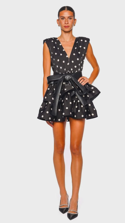 Adorned with timeless polka dots, this black and white mini dress exudes an air of playful elegance. The sleeveless design with a deep V-neckline and voluminous ruffle detailing creates a striking silhouette perfect for chic cocktail parties or sophisticated soirées. Crafted from the finest fabric, it features a cinched waist accentuated by an oversized bow, marrying modern style with classic charm. Pair with sleek stiletto heels to enhance its effortlessly glamorous aesthetic.
