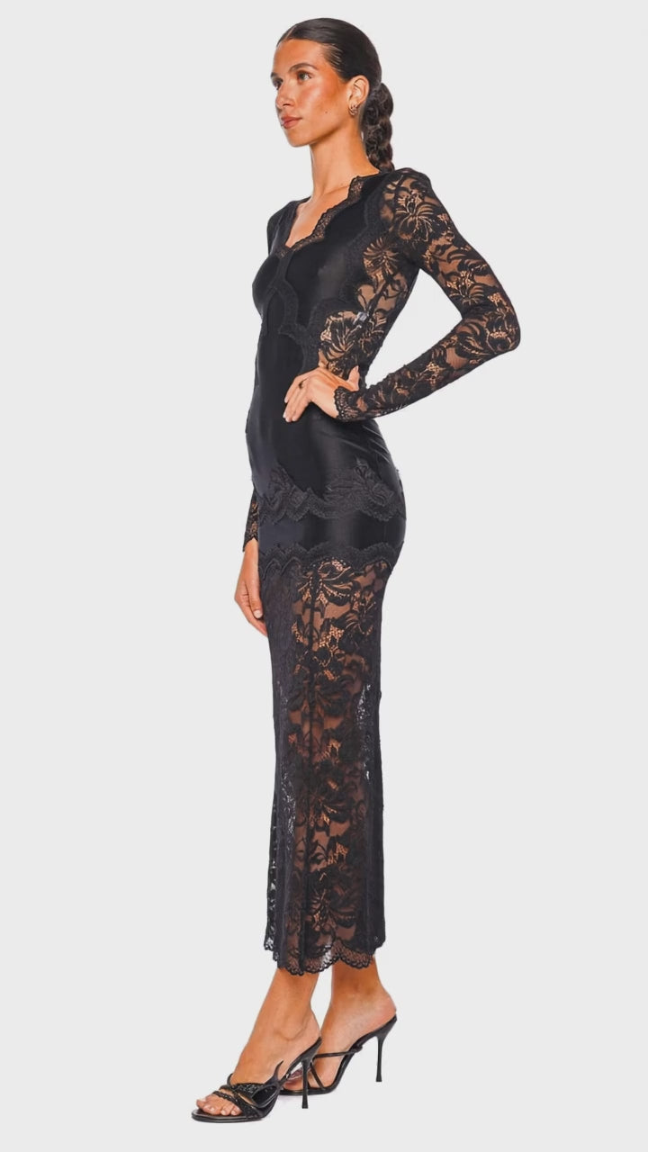 This stunning black maxi dress features intricate lace detailing, creating an alluring yet sophisticated silhouette. Its long sleeves and form-fitting bodice exude elegance, while the sheer lace skirt adds a touch of sensuality. Perfect for an upscale evening or formal event, this dress embodies refined luxury.