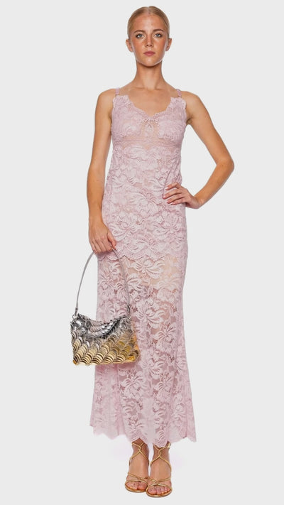 This sleeveless lace maxi dress features a V neckline with scalloped edges and inset lace trim detailing.