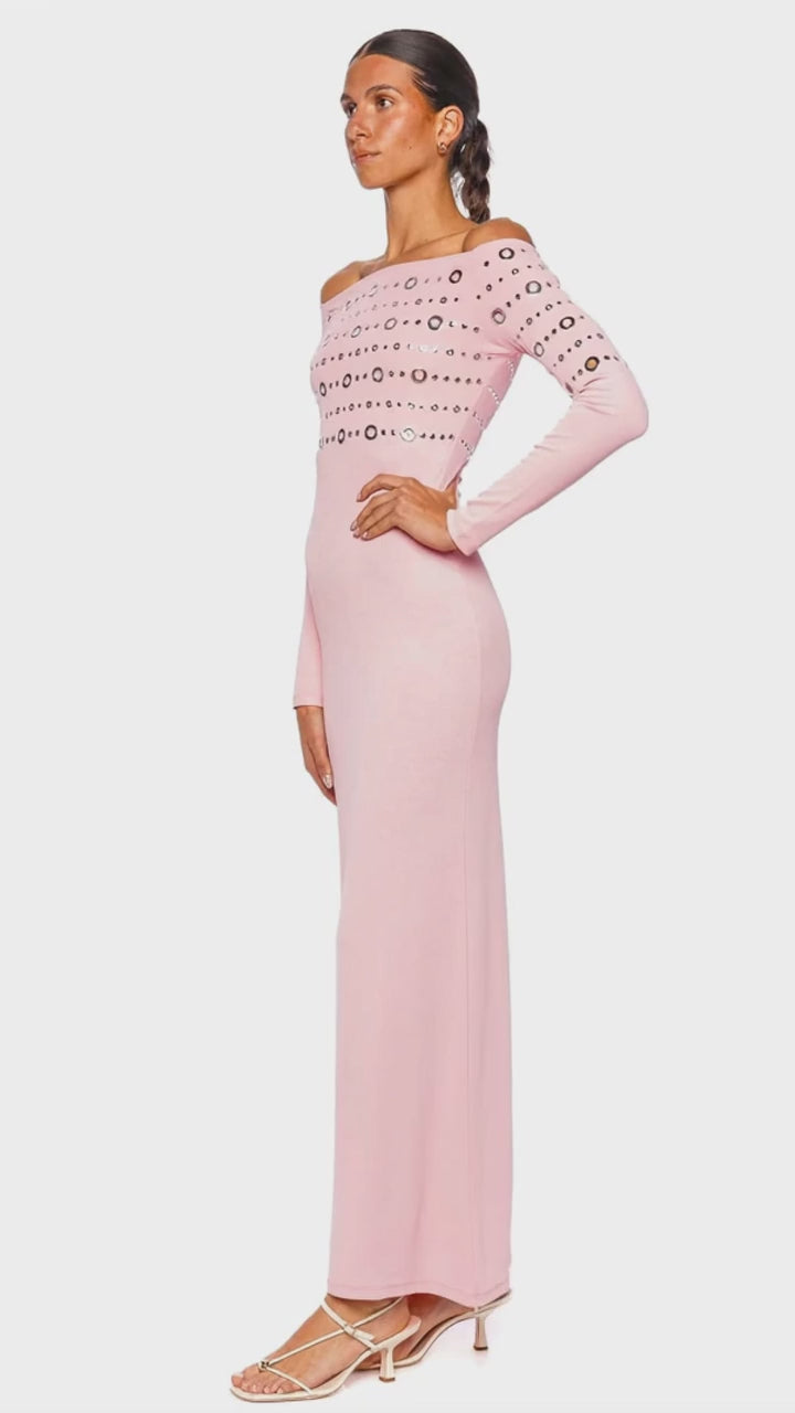 This striking off-shoulder maxi dress captivates with its luminous fluo pink hue and sleek, body-skimming silhouette. Rows of metallic grommet embellishments across the bodice and sleeves add an avant-garde touch, elevating the look with modern allure. Crafted from a premium stretch fabric, this piece gracefully highlights your figure while offering comfort and sophistication for any upscale event. Pair with strappy heels and minimal jewelry for an unforgettable, fashion-forward ensemble.