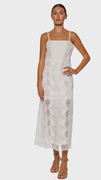 Embrace timeless elegance with the Rocio White Lace-Trim Maxi Dress, a piece that exudes sophistication with its exquisite lace details and classic silhouette. Crafted from premium materials, this dress promises comfort and style, making it ideal for summer soirées and elegant gatherings. Pair it with delicate jewelry and strappy heels to enhance its refined elegance.