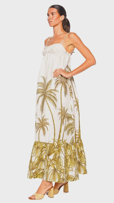 Embrace a tropical elegance with this exquisite Green Paradiso Maxi Dress, showcasing a lush palm print against a serene white backdrop. The flowing silhouette, paired with delicate spaghetti straps, captures both comfort and sophistication, perfect for sun-kissed destinations. Its luxurious fabric drapes beautifully, offering a sublime blend of style and grace for both casual and formal occasions.