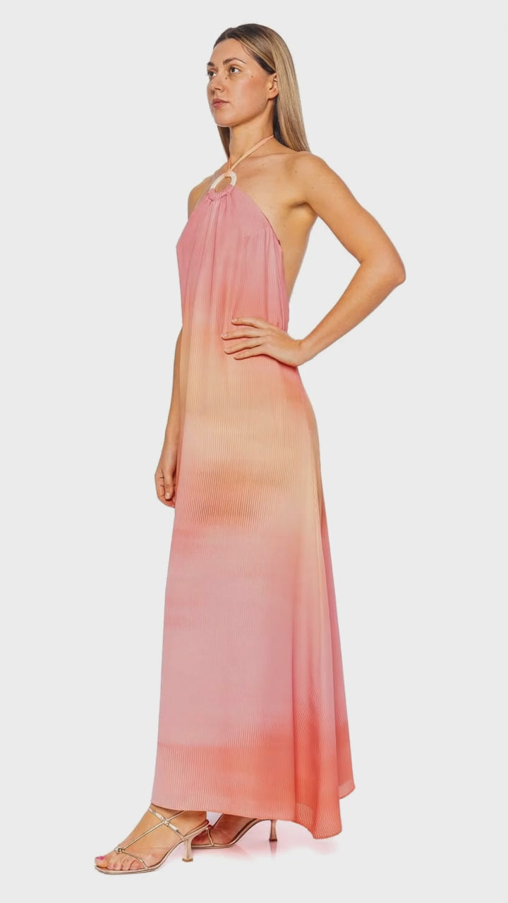 Embrace the allure of summer with the Rondine Coral Reef Halter Maxi Dress, a stunning piece that exudes effortless sophistication. This maxi dress captures attention with its gradient coral hue and modern halter neckline, gathered elegantly with a unique metallic ring. The luxurious flow of the fabric creates a graceful silhouette, perfect for beachside dinners or rooftop parties. Style it with strappy sandals and statement earrings to complete the look.