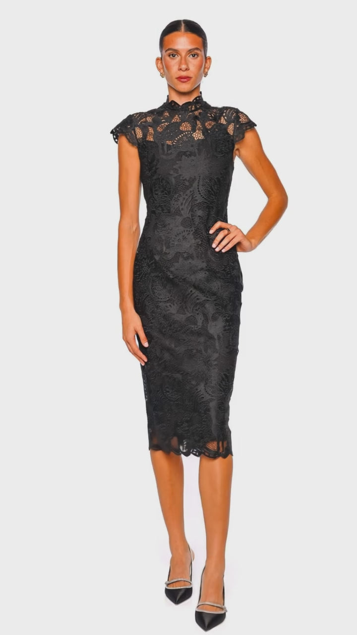 This Rosaline midi dress embodies sophistication with its intricate black lace overlay and elegant high mock neckline. The flutter sleeves and body-hugging fit create a silhouette that's both timeless and flattering. Perfect for elegant evenings or chic gatherings, this dress exudes luxury and class. Pair with sleek stilettos and delicate accessories for a refined, polished finish.