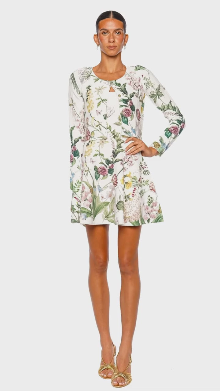 Rose Cardigan 9585 Bloomsfield Ivory is a refined cropped cardigan designed in an elegant botanical print over an ivory base. The lightweight knit drapes beautifully with long sleeves and a clean round neckline, finished with lustrous button detailing for a polished touch. Effortlessly chic, it elevates everything from matching dresses to sleek separates for day-to-evening sophistication. Wear it over a slip dress or pair with tailored trousers and strappy heels for a modern, feminine ensemble.