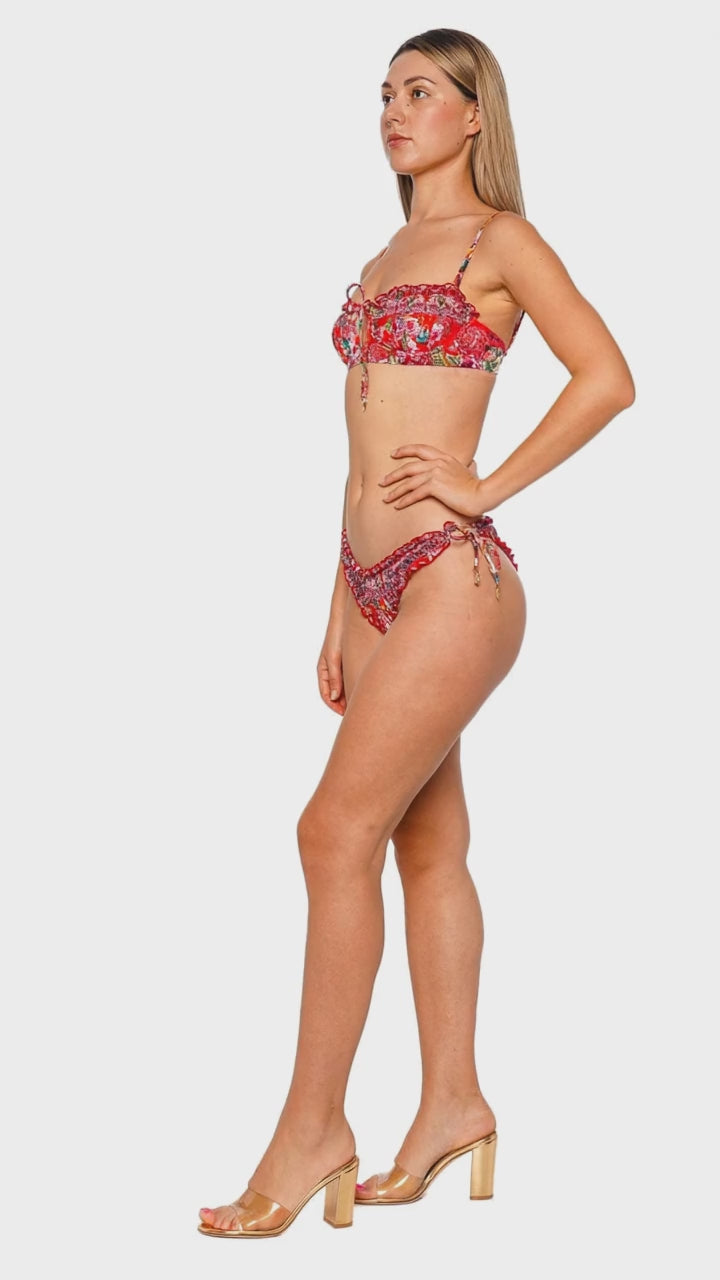 This vibrant bikini top features a stunning ruched cup design with an underwire for added support and shape. The tie front adds a playful and adjustable element, perfectly complementing its elegant print. Crafted from high-quality materials, this top offers both comfort and style, ideal for sun-drenched vacations or leisurely poolside afternoons. Pair it with matching bottoms and oversized sunglasses to complete a chic beach ensemble.