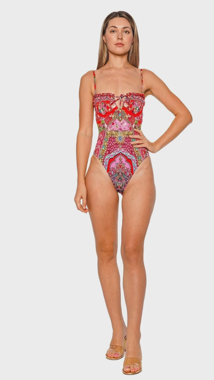 Embrace the elegance of summer with this stunning one-piece swimsuit that features a vibrant kaleidoscope of colors, perfectly captured in its eye-catching print. Delicately ruched cups and underwire support create a flattering silhouette, complemented by playful tie-front detail and adjustable straps for a customized fit. This piece blends sophistication and playful charm, making it an essential for any luxurious getaway.