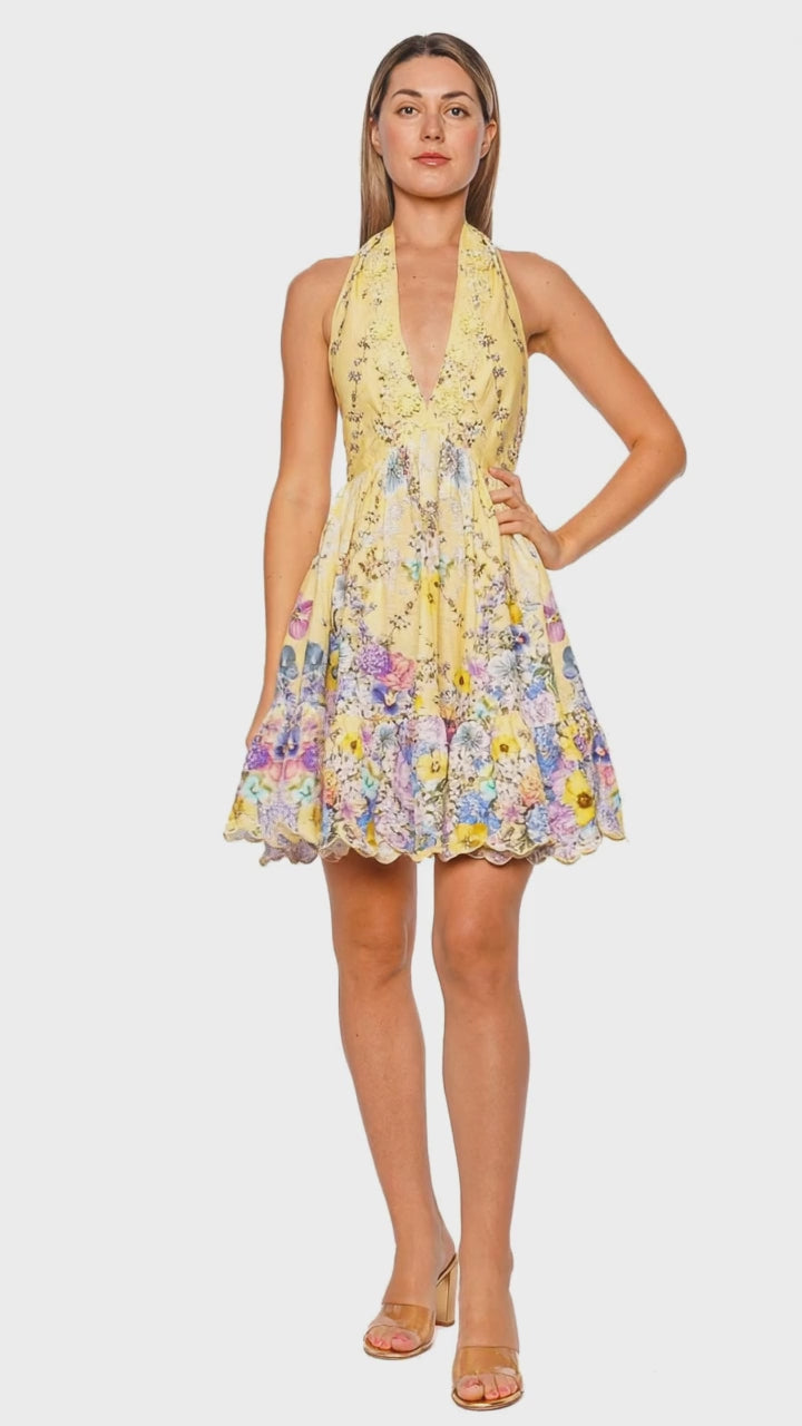Embrace sunny sophistication with the Darling Buds Yellow Halter Short Dress, featuring a vibrant floral print. This delicately ruffled hem adds a whimsical touch, while the halter neckline exudes elegance. Perfect for summer gatherings or a chic garden party, this dress radiates effortless allure. Pair it with strappy sandals and minimalistic jewelry for a flawless, stylish ensemble.