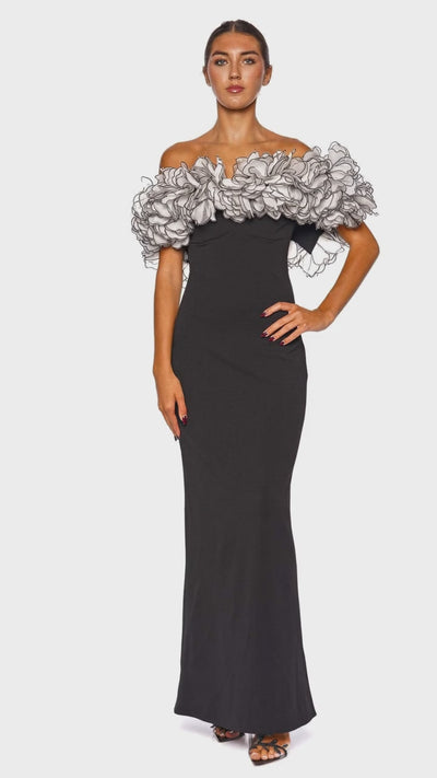 This gown features an off shoulder neckline with flutter applique details and a sleek, fitted bodice.