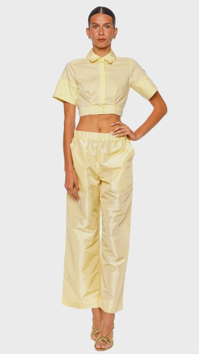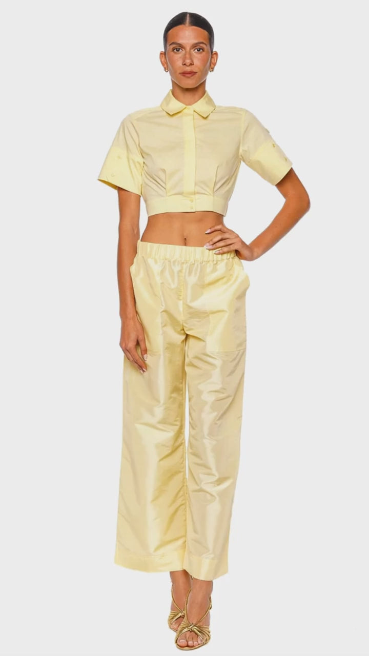 Elevate your wardrobe with this Sabrina crop top in a soft buttercream hue, crafted from a crisp, lightweight fabric for a sophisticated yet playful look. The sharply tailored collar and short sleeves with button detailing add a refined edge to its modern cropped silhouette. Perfect for both day and evening, this piece effortlessly transitions from casual brunches to chic soirées. Pair it with high-waisted trousers or a sleek skirt for an ensemble that exudes contemporary luxury.