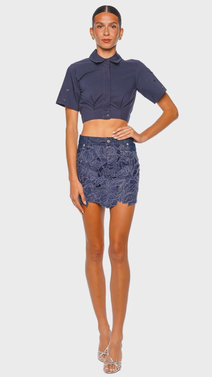 Elevate your wardrobe with this impeccably tailored crop top in a sophisticated midnight blue. Crafted from a structured, high-quality fabric, the design features a sharp collar, short sleeves with button detailing, and a modern cropped silhouette that highlights the waist. Its clean lines and versatile hue make it an instant statement piece, perfect for both elevated daywear and chic evening looks. Pair it with a high-waisted skirt or tailored trousers for effortless sophistication.