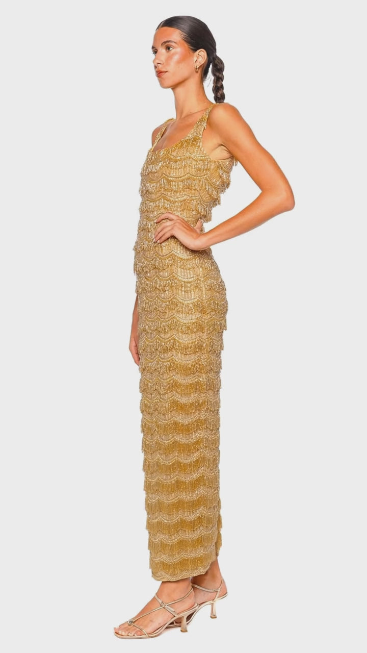 This breathtaking full-length gown features a cascade of shimmering gold beads creating a luxurious textured effect. Designed with a classic silhouette, the gown presents an elegant scoop neckline and a meticulously crafted beaded fringe for a glamorous, opulent impression. Perfect for evening events and special occasions, it showcases an exquisite blend of sophistication and modern allure. Pair it with minimal jewelry and stilettos to complete a show-stopping look.