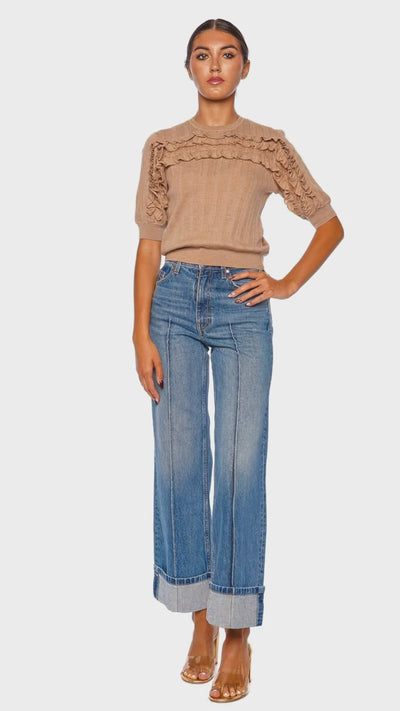 Delight in effortless chic with this Camel Melange knit top, featuring exquisite ruffle detailing that enhances its sophisticated design. Made from premium materials, this top combines comfort and fashion-forward style, making it perfect for both casual and polished looks. Pair it with high-waisted jeans and block heels to complete a refined, contemporary ensemble.