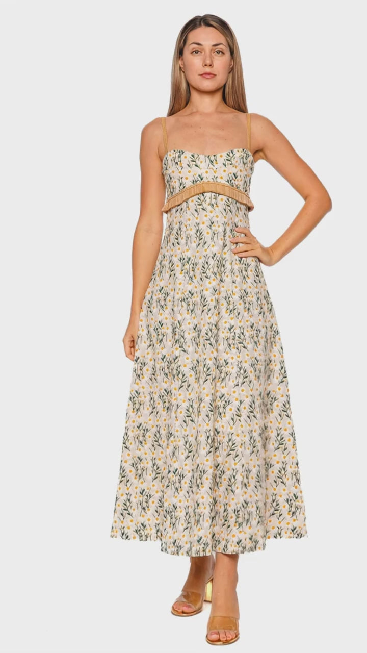 Salvador Daisy Meadow Raffia Fringe Midi Dress
