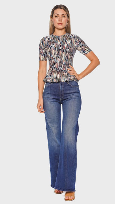 This stunning multicolor peplum top exudes a sense of playful sophistication and elegance. Crafted with a blend of vibrant hues, this short sleeve design elevates any outfit with its flattering silhouette and artistic appeal. The top's unique space-dyed yarn pattern and peplum cut offer a touch of chic dynamism, perfect for both casual and dressy occasions. Pair it with high-waisted jeans and heels for a stylish, contemporary ensemble.