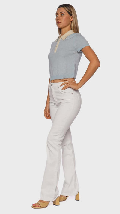 This sophisticated polo top merges a classic silhouette with a modern cropped design, crafted in a serene sky blue hue. The soft knit fabric embraces understated elegance, providing a touch of refinement to casual ensembles. With its chic appeal, this top is perfect for daily wear or relaxed outings. Pair it with high-waisted jeans and loafers for a trend-forward look.