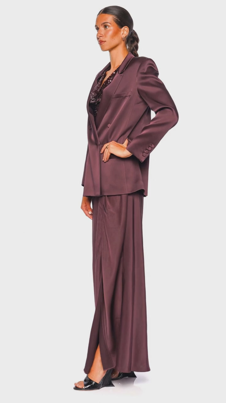 Elevate your wardrobe with this sumptuous Mulberry Satin Double Breasted Blazer, a testament to classic tailoring with a modern twist. This piece features a refined double-breasted silhouette and rich satin finish that exudes luxury and sophistication. Ideal for both formal occasions and chic casual settings, pair it with sleek trousers for a commanding presence.