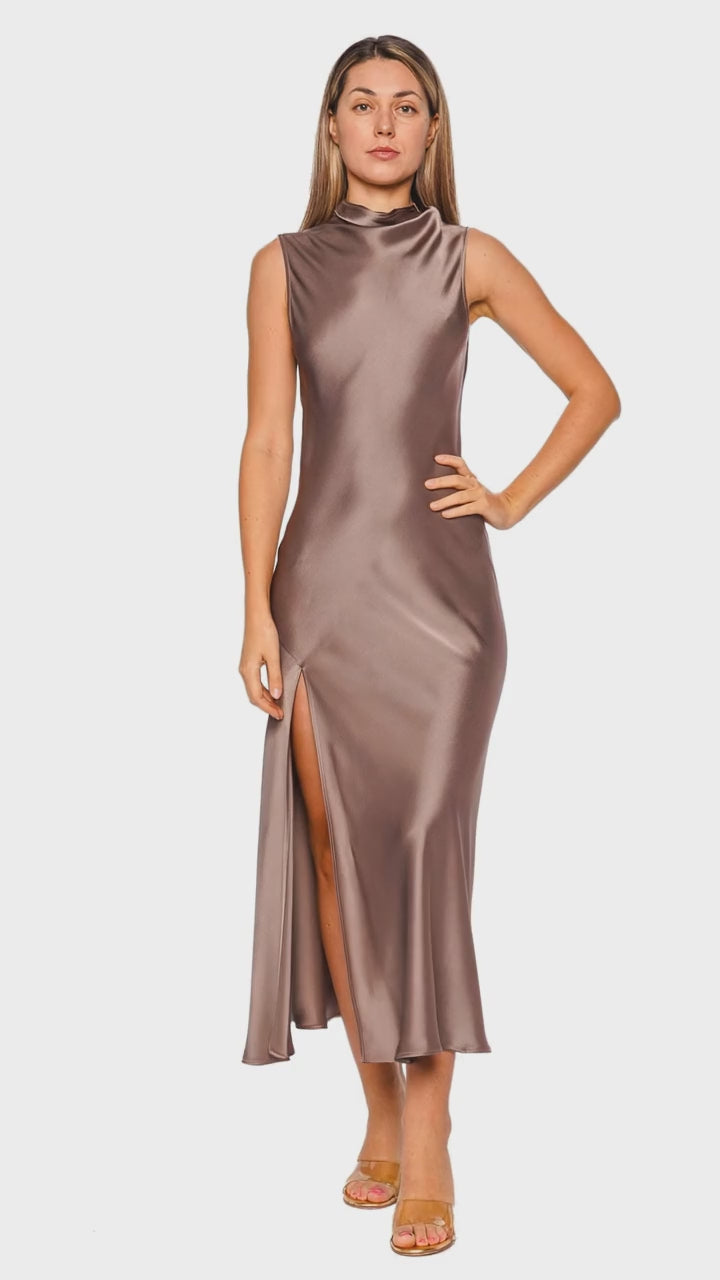 Experience the understated elegance of the Cinder Satin Drape Neck Sleeveless Midi Dress. This luxurious piece is crafted from high-quality satin that glides gracefully over the body, featuring a sophisticated drape neck and an enticing side slit. Perfect for evening events or upscale gatherings, this dress embodies modern elegance and versatility. Pair with chic heels and minimal accessories for a striking evening ensemble.
