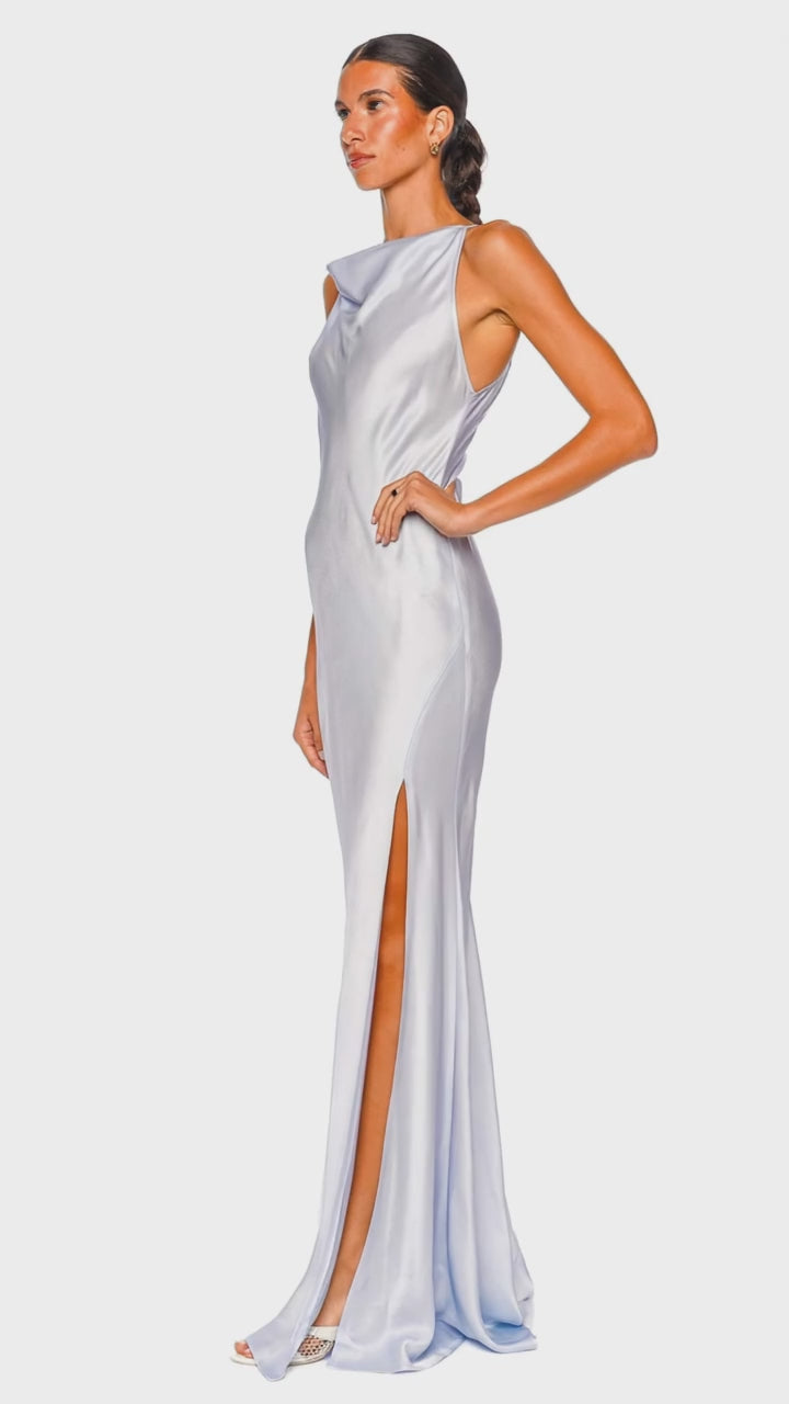 This stunning gown captivates with its lustrous satin fabric and sophisticated halter neckline. The elegant cowl neck drapes meticulously, enhancing the fluid silhouette that gracefully skims the figure. Perfect for glamorous events, the gown's timeless design exudes opulence and poise. Pair it with minimalistic accessories and stiletto heels for an unforgettable ensemble.