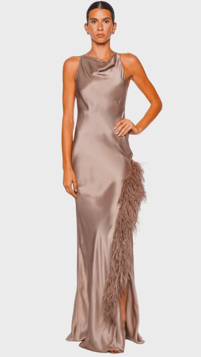 Oat Satin Halter Feather Trim Gown