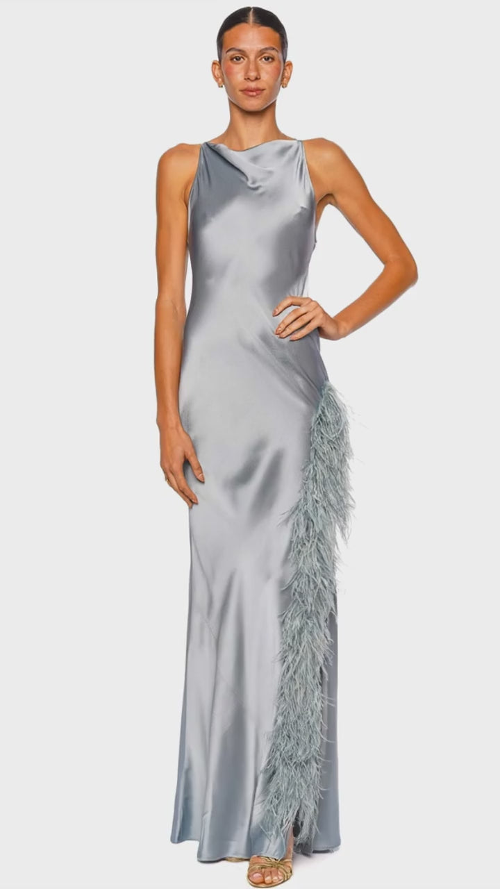 This striking satin gown is designed in a sleek light slate hue with a fluid full-length silhouette that skims the body beautifully. The high halter neckline and lustrous finish create an effortlessly elegant look, while the dramatic feather trim cascading along the side slit adds statement-making glamour. Refined yet bold, this piece is perfect for black-tie events, galas, and unforgettable evening entrances. Style it with metallic heels and sculptural jewelry for a polished couture-inspired finish.