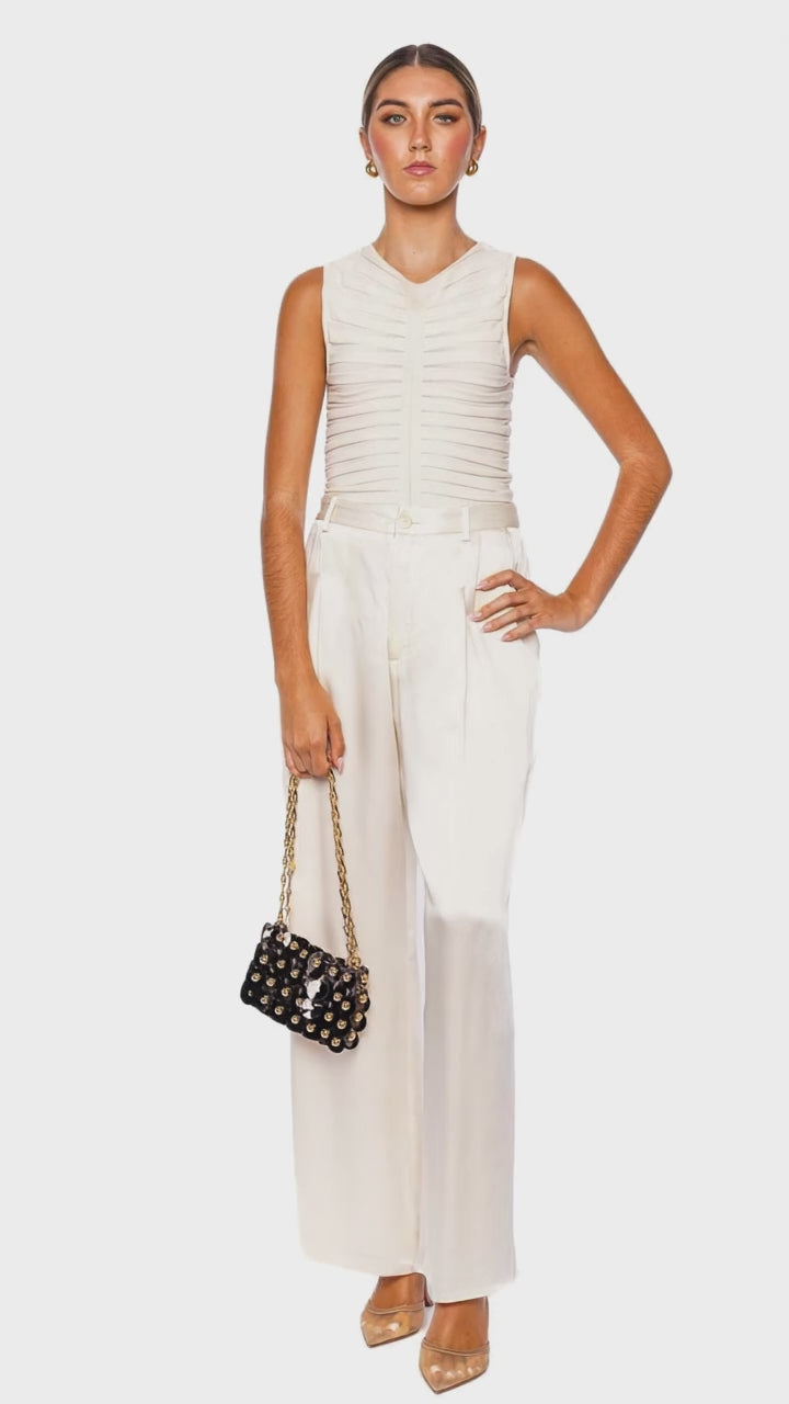 These high waisted satin pants feature a wide leg silhouette and a single front pleated detail.