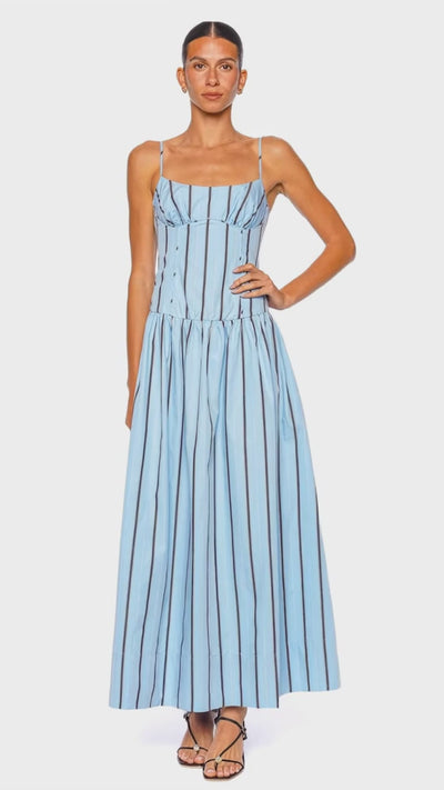Elevate your summer wardrobe with this Saxon panelled bustier maxi dress, meticulously crafted in a refreshing blue stripe. The structured bodice with delicate spaghetti straps creates a flattering, feminine silhouette, while the flowing maxi skirt adds effortless elegance. Made from premium lightweight fabric, this piece exudes sophistication and is perfect for everything from daytime soirées to sunset dinners. Pair with strappy heels and minimal jewelry for a chic, trend-setting ensemble.