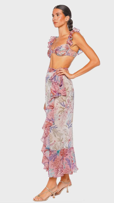 This enchanting skirt features a captivating seaweed-inspired print, artistically blending off-white and pink hues. Crafted from a lightweight fabric, its ruffled wrap design adds a touch of playful elegance, making it an ideal choice for beachside escapes or casual weekend brunches. The skirt's flowy silhouette and vibrant colors exude a sense of relaxed luxury, perfect for modern fashion-forward styling.