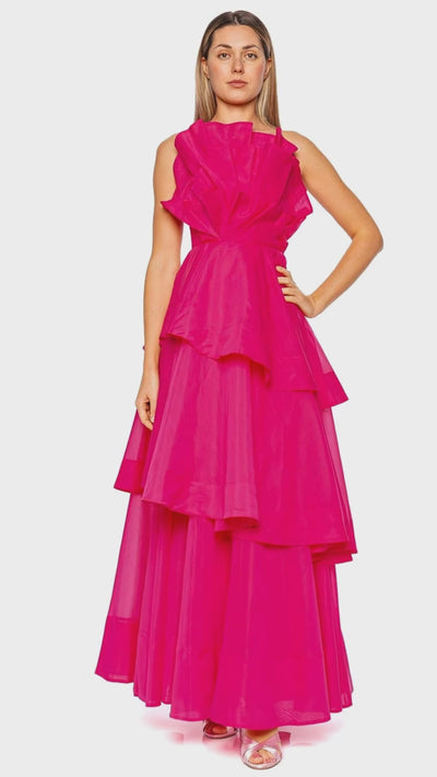 Command attention with the Selestia Magenta Strapless Layered Gown, a striking masterpiece crafted for the modern woman who dares to stand out. The bold magenta hue is complemented by artfully draped layers, creating a captivating silhouette that exudes elegance and refinement. Ideal for gala evenings and red-carpet events, this gown embodies sophisticated luxury with a modern twist.
