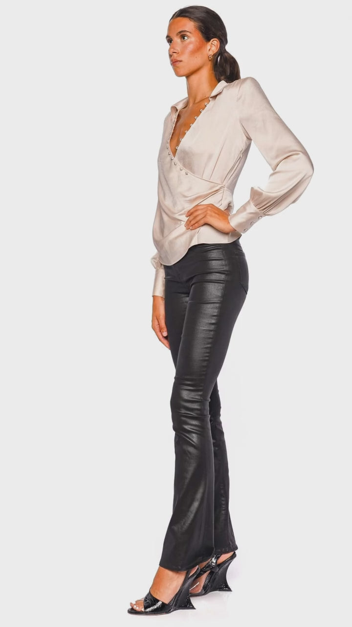 These Selma High-Rise Baby Boot Jeans feature a sleek noir coated finish that adds a modern edge to any ensemble. The luxurious fabric provides a flattering silhouette that transitions effortlessly from day to night. Perfectly designed for the trendsetter, these pants offer unmatched elegance and sophistication. Pair with a silky blouse and pointed-toe heels for an elevated, fashion-forward look.