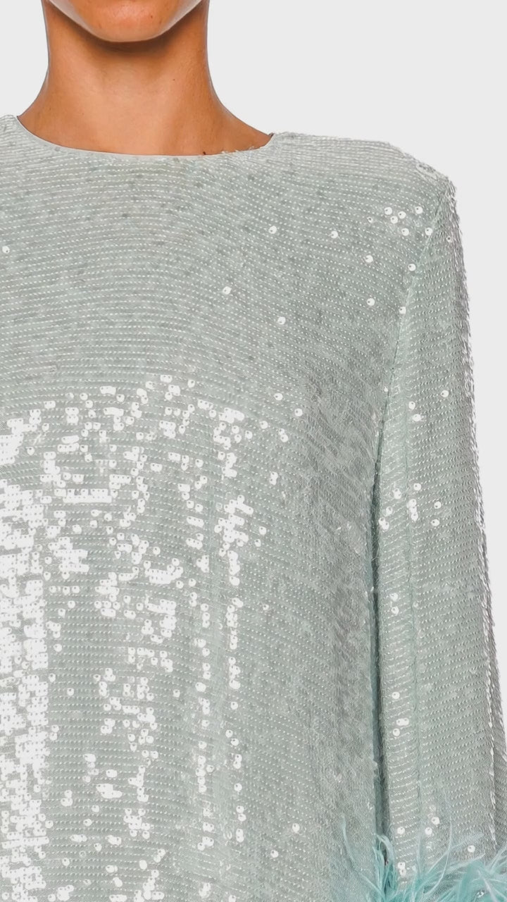 Sequin Shift Dress with Feather Cuffs Long Sleeves Soft Blue