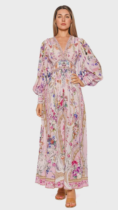 This stunning maxi dress showcases an ethereal blend of palatial pastels with intricate floral and scroll patterns, exuding elegance and charm. The shaped waistband cinches the silhouette for a flattering fit, while the gathered sleeves add a touch of romantic flair. Designed for those who appreciate luxurious detail and sophisticated style, it's perfect for garden parties and upscale gatherings. Pair it with delicate jewelry and chic heels to complete your refined look.