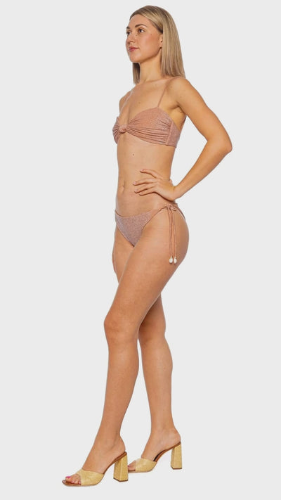 Embrace sun-drenched sophistication with the Heliconia Shimmering Soft Peach Bikini Top. This luminous piece captivates with its glistening shimmer fabric, enhancing the alluring bandeau style with subtle, yet striking elegance. Designed with meticulous craftsmanship, it's perfect for making a statement by the poolside or beachside, combining allure and comfort flawlessly.