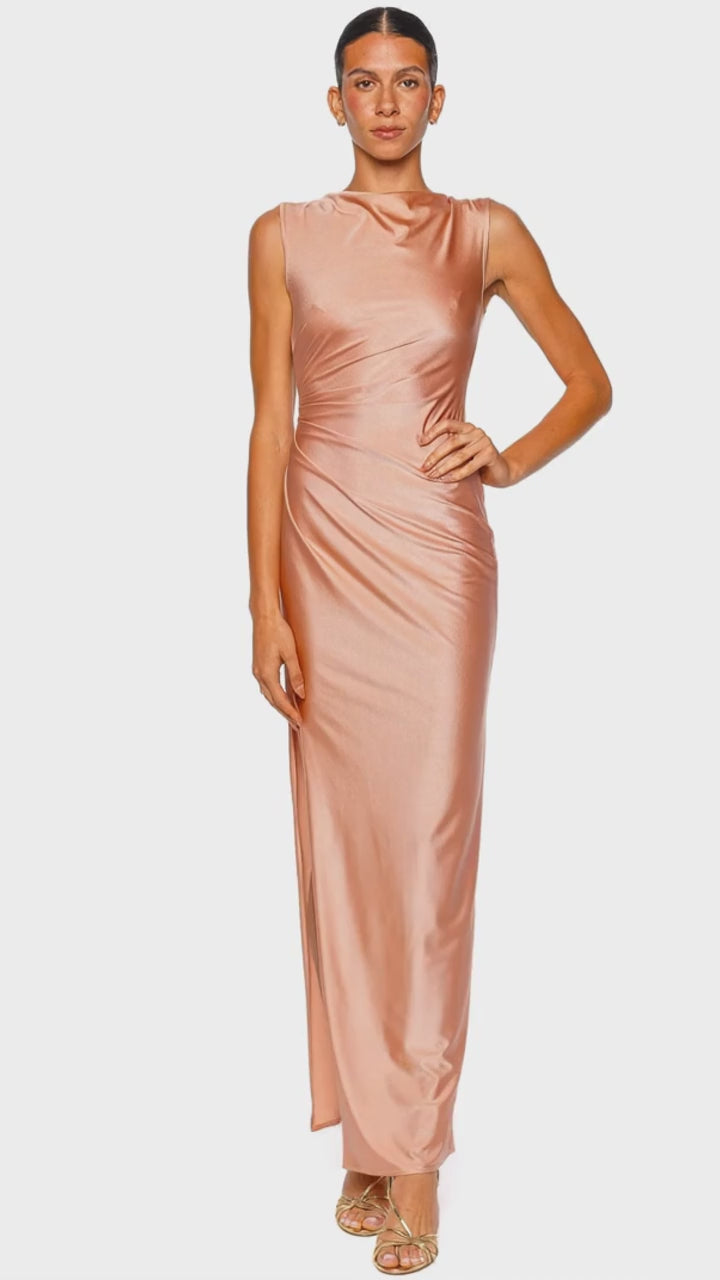 This luminous gown is crafted in a sleek shine jersey that skims the body with an effortlessly elegant finish. The sleeveless silhouette is elevated by soft ruching through the waist, a refined draped neckline, and a sultry side slit that adds graceful movement. Its warm dune hue and fluid column shape make it a striking choice for formal evenings, weddings, and elevated special occasions. Style it with metallic heels and sculptural jewelry for a polished, modern statement.