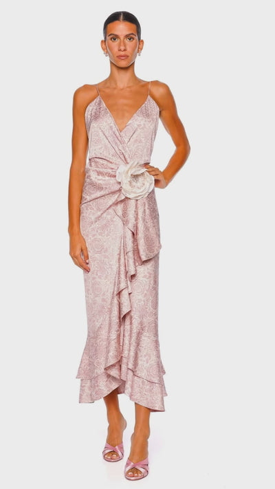 Indulge in the ethereal elegance of the Shiraz Midi Dress that captivates with its pastel pink hue and intricate paisley patterns. Its lightweight fabric cascades effortlessly in a tiered ruffle hem, adding a touch of whimsy to the sophisticated silhouette, while the spaghetti straps and deep V-neckline exude a polished, modern allure. Perfect for any upscale gathering, this dress radiates sophistication. Pair with pearl earrings and delicate sandals for an effortlessly chic ensemble.