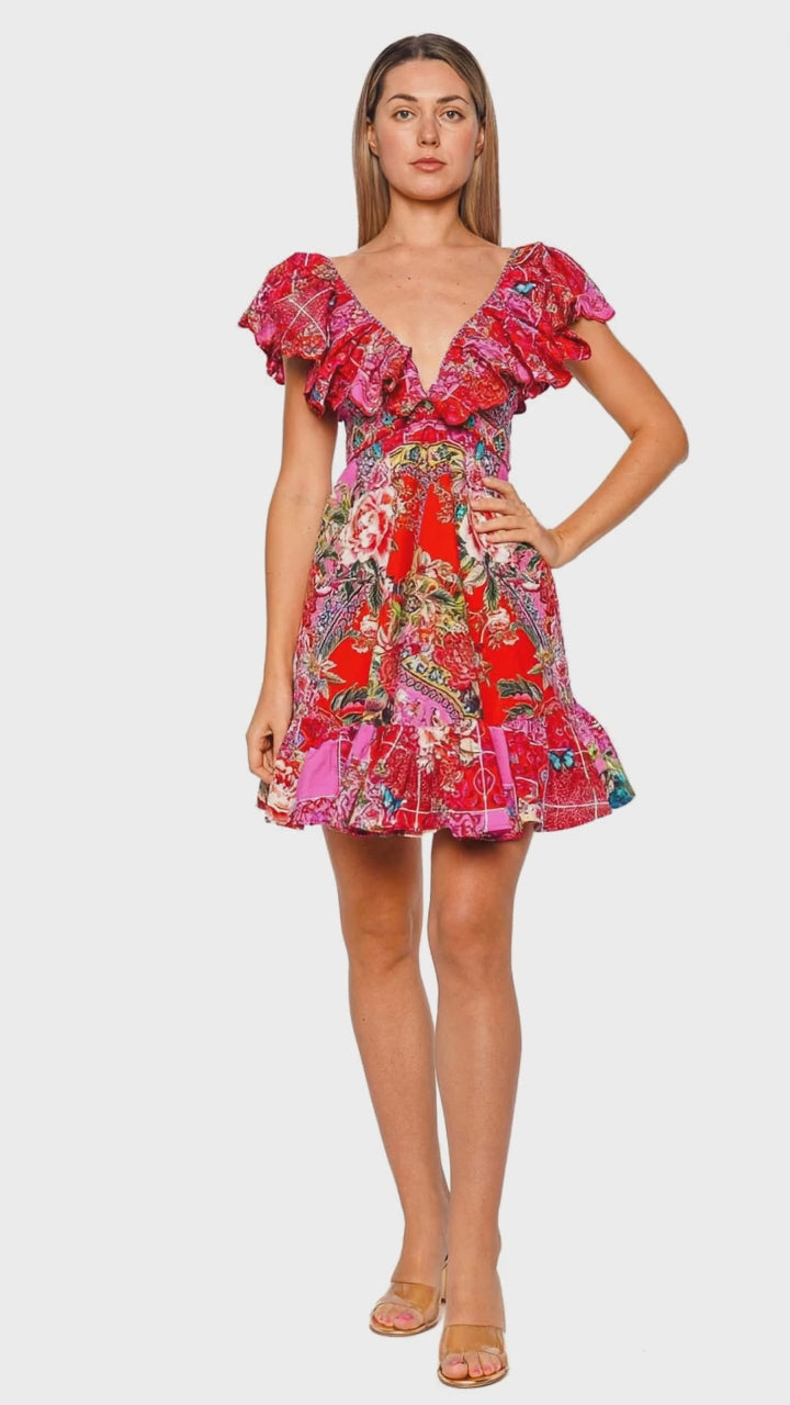 Immerse yourself in luxury with the Heirloom Empire V-Neck Frill Short Dress, an exquisite creation that captures the essence of vibrant femininity. Crafted with meticulous attention to detail, this dress features a striking floral print in a rich red hue, accentuated by dramatic frill sleeves and a plunging V-neckline. The flowy skirt and fitted bodice ensure a flattering fit, making it a standout piece for any occasion. Pair it with statement heels and minimal jewelry to keep the focus on its breathtaking design.
