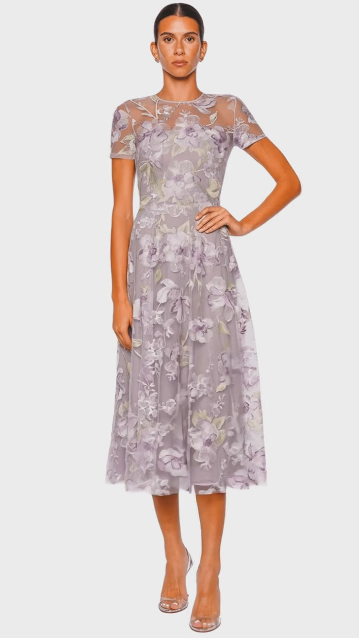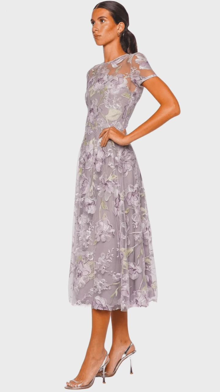 Immerse yourself in elegance with this lilac floral cocktail dress, featuring an exquisite illusion neckline and short sleeves. Its intricate floral embroidery and sheer detailing exude sophistication, making it the perfect centerpiece for any occasion. Designed to gracefully enhance your silhouette, this dress promises a captivating charm that is both timeless and contemporary.