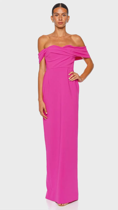 The Sofia Gown makes a striking entrance in a vivid hot pink hue with an elegant off-shoulder neckline and beautifully draped foldover bodice. Designed in a sleek column silhouette, this floor-length style flatters the figure with clean lines and a refined, modern finish. The structured fabrication lends a polished feel, while the back slit adds graceful movement for formal evenings and special occasions. Pair it with metallic heels and statement earrings for an effortlessly sophisticated event look.