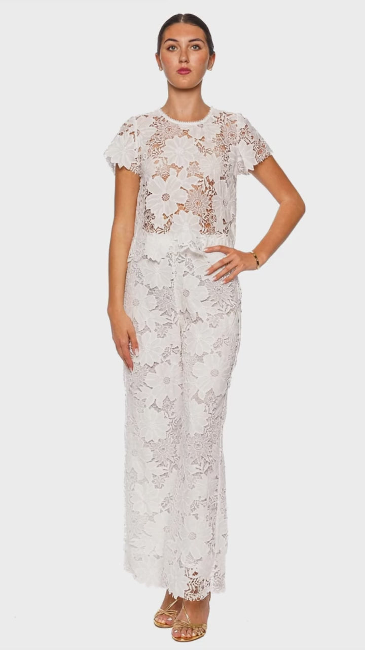 Elegantly crafted from intricate lace, the Solange White Lace Wide-Leg Pants exude an air of sophistication and modern femininity. The wide-leg silhouette offers a graceful flow with each step, creating an alluring and fashionable statement. Perfect for luxuriant evening outings or upscale day events, these pants can be effortlessly styled with a fitted top or matching lace blouse.