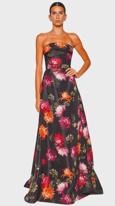 Embrace the allure of sophistication with this stunning black multi floral strapless gown. Crafted from luxurious faille fabric, it exudes elegance with its vibrant floral patterns, making it a perfect choice for graceful evening affairs. The classic A-line silhouette flatters every figure, offering a timeless appeal that's both romantic and refined. Pair it with sleek stiletto heels and sparkling jewelry for a captivating look.